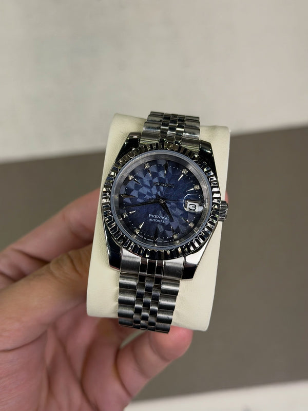 - Brand Markings: With the branding of "Presage" and "Automatic" clearly displayed, this timepiece underscores its automatic movement prowess, assuring precision and reliability in every tick.