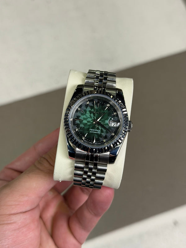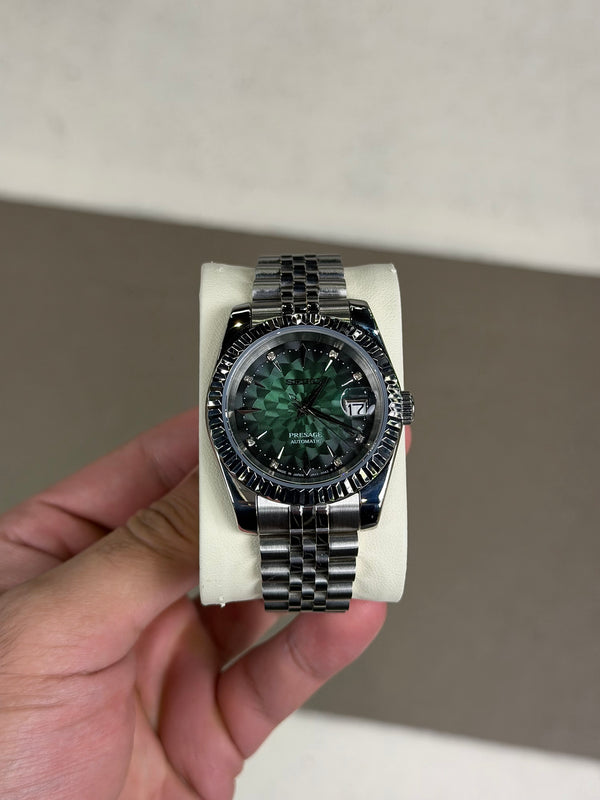 Introducing the "Geometric Mint Green Dial" from the Presage series, a stunning blend of tradition and modernity crafted for aficionados of fine horology. This exquisite timepiece boasts a polished stainless steel case and bracelet, offering a sophisticated and durable elegance that stands out in any collection.
