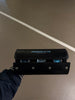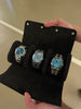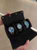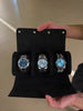 Inside, the watch box features three distinct slots, perfectly accommodating each of your metallic-braced watches. The first watch, located on the left, boasts a striking blue face adorned with multiple sub-dials, indicating its potential chronograph function. The middle watch showcases a textured blue dial with silver hour markers and hands, along with a practical date window for added functionality. The right watch features a smooth blue face with clear hour markers and another date window, presenting a classic design that complements the others.