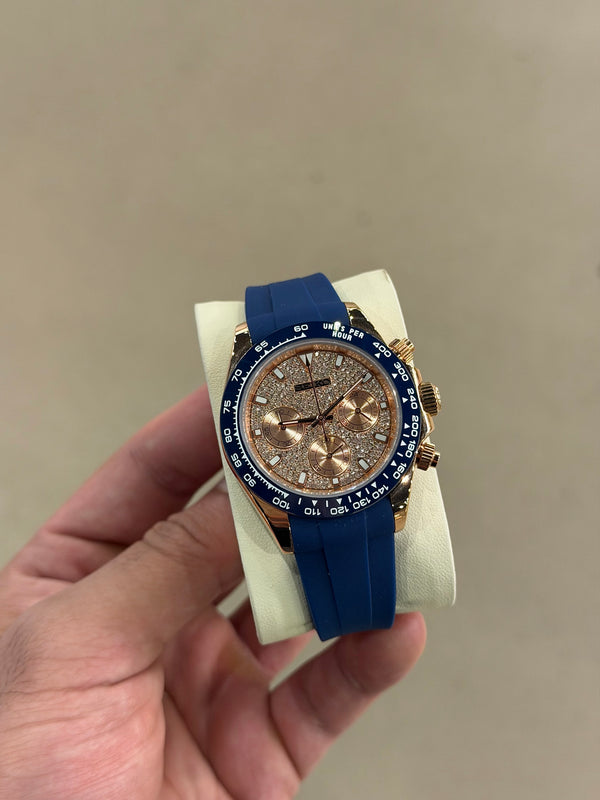The “Chrono dark blue Dial” watch is a luxurious piece featuring a deep blue rubber strap paired with a rose gold case. The blue bezel includes a tachymetric scale with white numerals. Its dial is adorned with sparkling stones, adding elegance and glamour. With three sub-dials for chronograph functions and a date indicator, the gold hour markers and hands perfectly complement the rose gold accents. The watch, presented on a light-colored cushion, exudes sophistication and style.