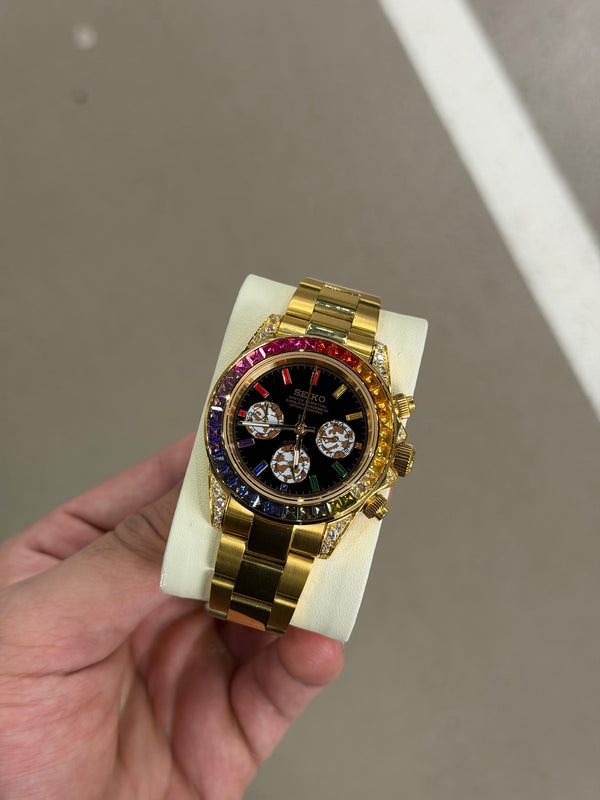 Elevate your style with our exquisite Global Rainbow Storm watch, a stunning fusion of elegance and vibrancy. This luxurious Seiko timepiece features a gold metal bracelet and casing, exuding sophistication at every glance. What truly sets this watch apart is its bezel, adorned with a mesmerizing array of multicolored gemstones arranged in a gradient, capturing the essence of a vibrant storm.