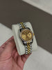 The watch's beauty is further accentuated by its two-tone case, which seamlessly combines rich, warm gold and cool, refined silver, creating a harmonious balance that suits any occasion. The polished finish of the gold and silver tones gives the watch a refined, elegant shine, while the sleek contours of the case ensure a comfortable fit on the wrist. The careful interplay of the two metals highlights the meticulous attention to detail that defines this exceptional timepiece.