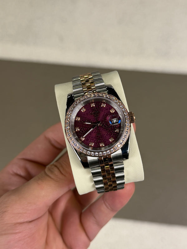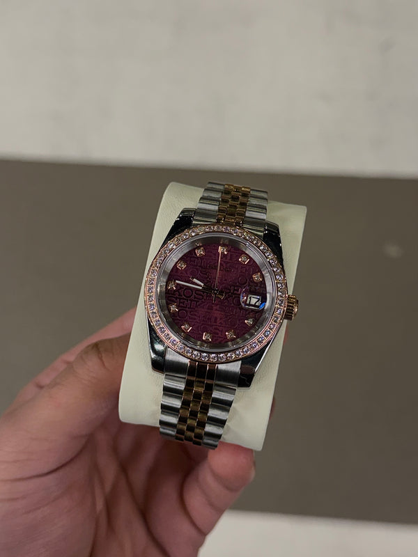 The "Maroon Majesty Dial" watch exudes luxury and sophistication with its exquisite design. Featuring a two-tone metal bracelet that combines silver and rose gold links, this watch offers a versatile and classy appearance. The bezel is adorned with sparkling gemstones, adding to its luxurious allure.
