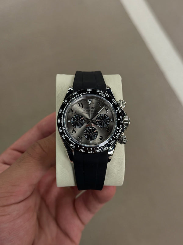 The "Metallic Grey Arabic Dial" watch is a sleek and sophisticated timepiece that seamlessly blends elegance with modern design. Featuring a shiny grey dial, it is adorned with striking silver Arabic numerals that provide a contemporary yet classic touch, ensuring excellent legibility. The high-quality rubber strap adds comfort and durability, making it perfect for both formal and casual occasions. This watch is a perfect accessory for those who appreciate refined craftsmanship and stylish functionality.