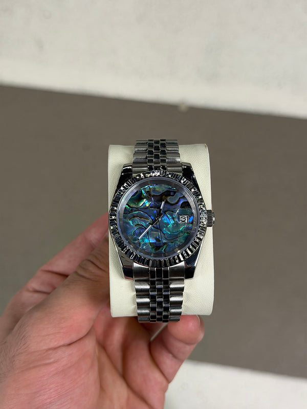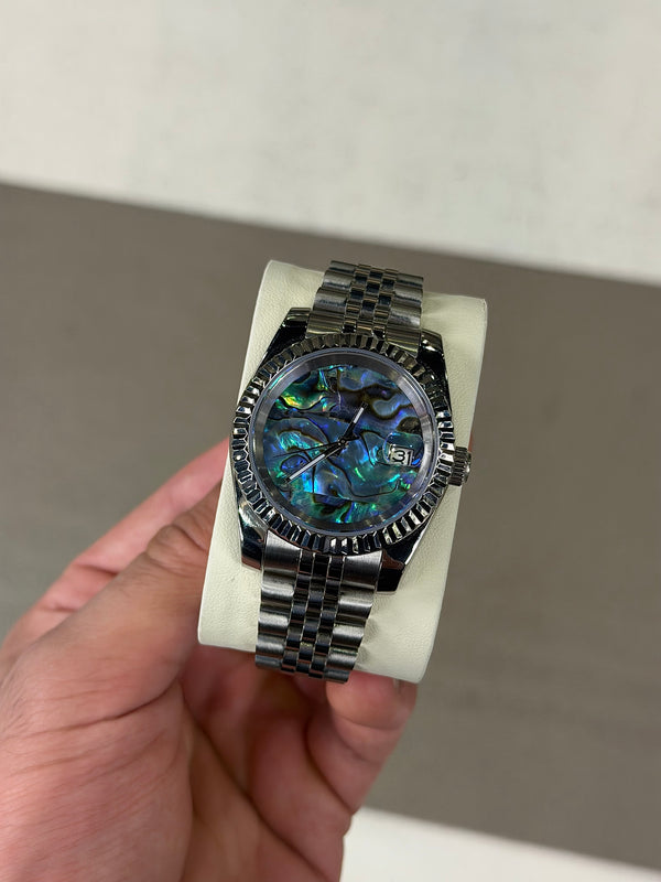 Introducing the "Mysterious Majesty Dial" watch, a captivating timepiece that blends elegance with mystery. Its striking, iridescent dial crafted from abalone or mother-of-pearl showcases a mesmerizing play of blue, green, and purple hues, ensuring each glance is a visual delight. Encased in polished stainless steel, the watch features a fluted bezel that adds a touch of classic sophistication.