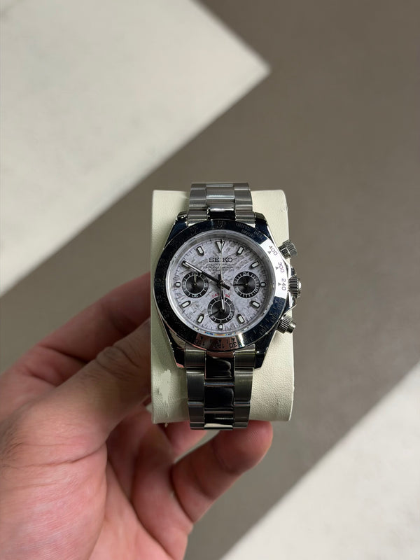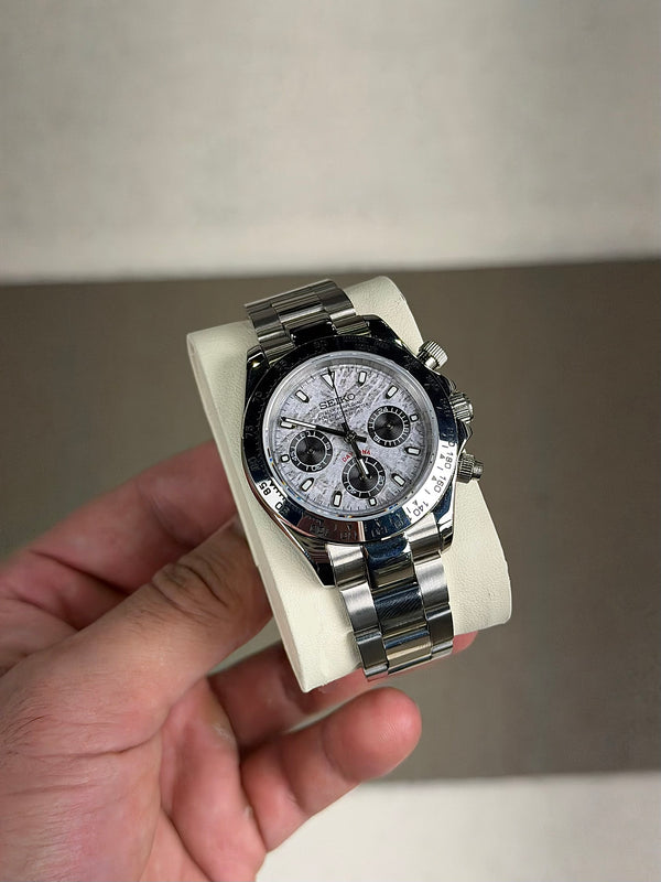 Every detail of the "Platinum Meteorite" is crafted for the discerning individual who values both sophistication and functionality. With its user-friendly side buttons for operating the chronograph features, this watch is designed to meet the needs of modern lifestyles while being a statement of timeless elegance.