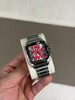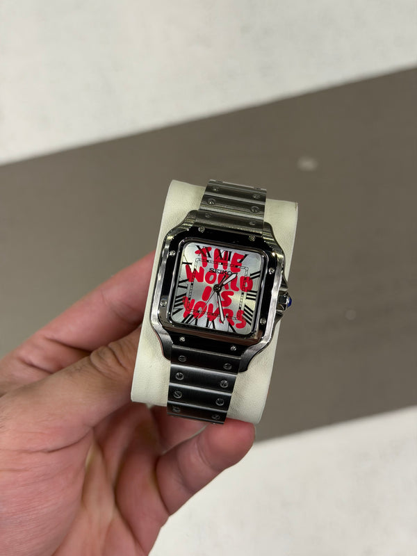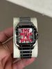 The sleek stainless steel case and band provide a classic yet modern look, while the intricate engraved bezel adds a touch of elegance. The dial features a minimalist design with bold Roman numerals, allowing you to keep track of the hours in style.
